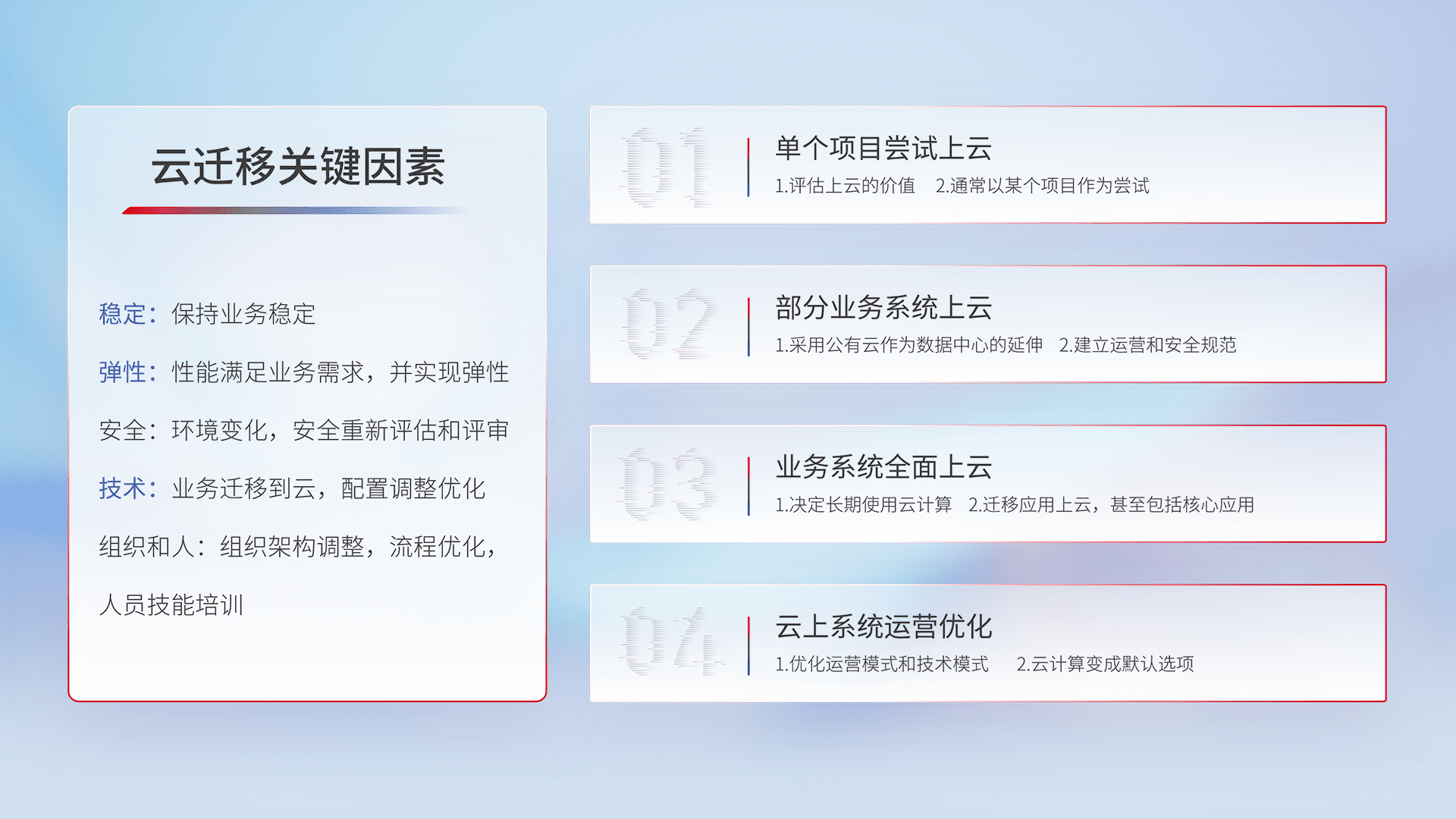 结合实际业务,,,从规划设计、、、云平台选型、、云原生改造、、、数据迁移、、、集成交付,,,迁移全过程为客户识别最佳上云路径,,,,做好风险识别管理,,,,设计网络架构、、身份权限、、安全审计合规、、操作审计、、日志审计、、监控告警策略、、、、多站点容灾设计等,,,对云上基础设施进行整体规划,,,,提升IT治理水平,,,,以满足弹性、、、、高可用、、、、高性能的需求。。。。