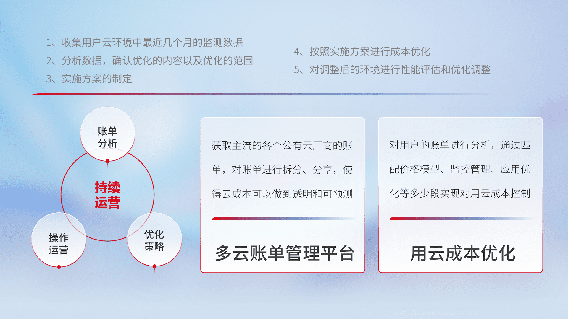 通过多云纳管,,,,以统一的资源数据模型把客户的云资源进行抽象和封装,,进而实现对多云资源的统一操作,,,,保障云资源管理的可靠性、、、稳定性与可用性。。。。量身定制化运维内容,,配置、、开发运维、、、、补丁管理、、备份、、监控、、、、认证和访问管理、、、审计和日常巡检等,,,保障在用云过程中的可靠度,,,稳定度以及高可用率。。。